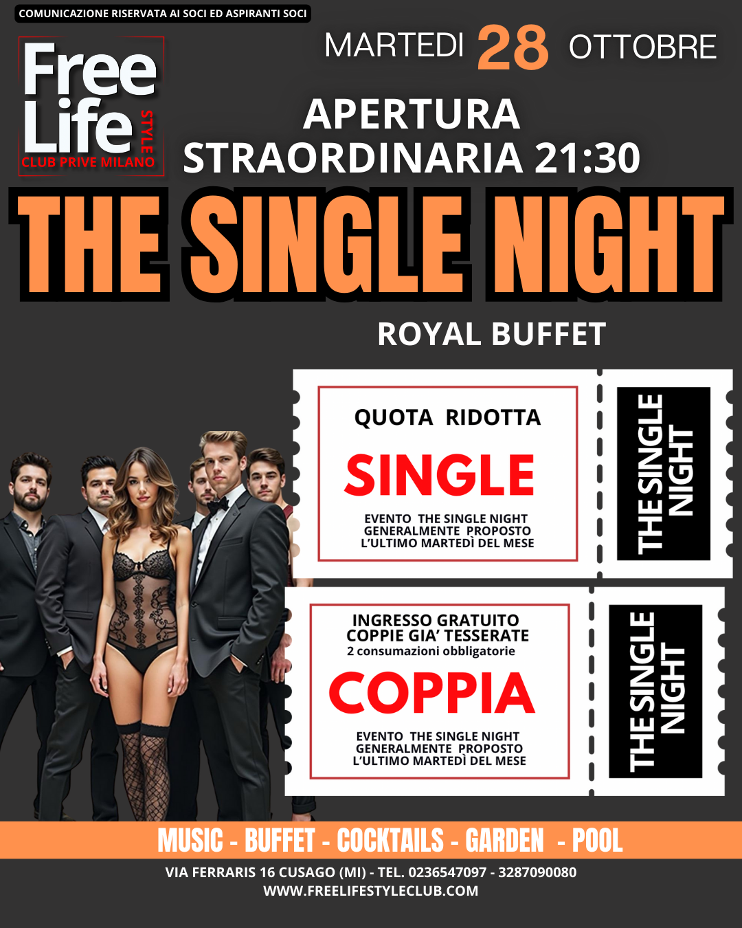THE SINGLE NIGHT Al Freelife Style Club ogni evento è pensato per creare l’atmosfera ideale per esplorare la propria sessualità in totale libertà e rispetto. Organizziamo serate tematiche, feste private e incontri selezionati, dove il divertimento e la discrezione sono garantiti