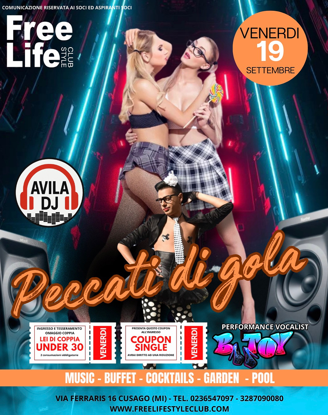 Peccati di gola Al Freelife Style Club ogni evento è pensato per creare l’atmosfera ideale per esplorare la propria sessualità in totale libertà e rispetto. Organizziamo serate tematiche, feste private e incontri selezionati, dove il divertimento e la discrezione sono garantiti